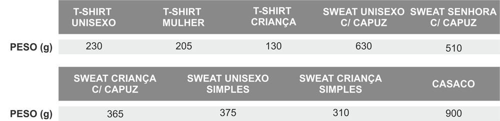 O peso foi calculado pela peça de maior tamanho de cada artigo, sendo por isso um valor aproximado de referência.